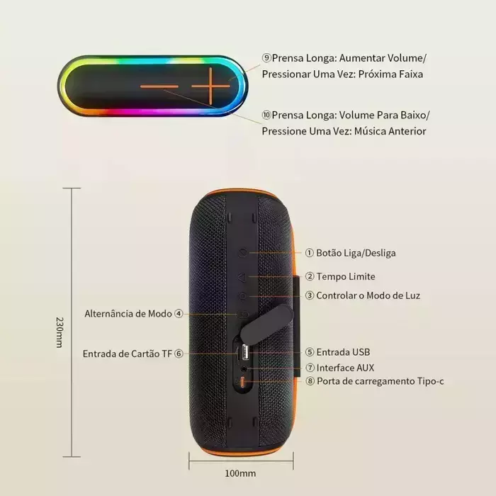 • Dimensões: 23 cm x 10 cm x 10 cm